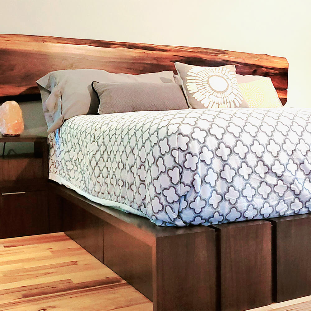 Este es uno de nuestros diseños favoritos. La pureza estructural y los detalles hacen que esta cama sea tan funcional como hermosa. Cada mesa de noche integradas puede tener una o dos gavetas, y consta de amplio espacio para almacenar con gaveteros debajo de la cama. Se complementa con una pieza de madera orgánica como cabecera, que ha sido seleccionada cuidadosamente y puede ser instalada en forma horizontal una pieza o vertical, con dos piezas. Puede ser diseñada en la madera disponible de su elección. Tamaños Queen y King. Precio desde $3,900.