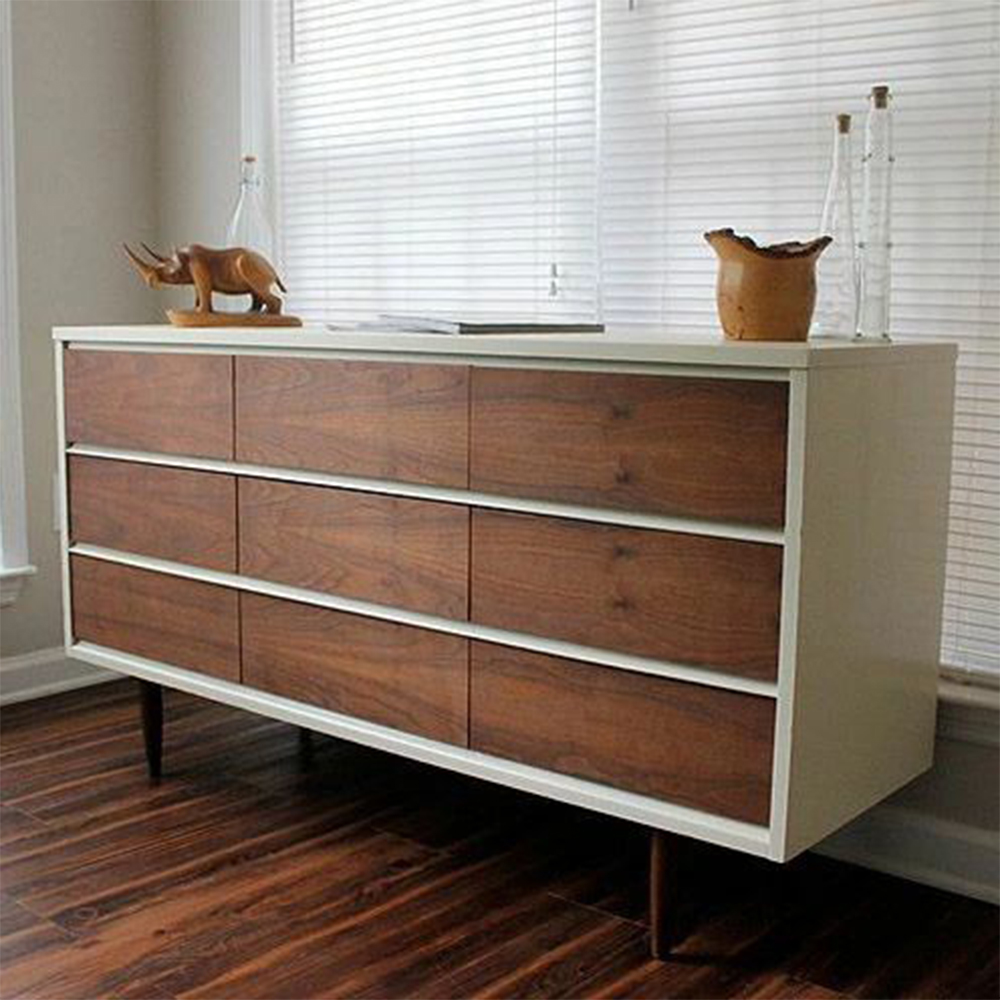 El acabado blanco sereno de esta pieza ofrece un contraste sorprendente con los cajones frontales y las patas que hacen juego con las vetas naturales de la madera, dándole un aire de elegancia natural al espacio. Los nueve gaveteros le darán amplitud de almacenamiento y la ausencia de cerrajes aumentan la simplicidad de esta pieza. Los gaveteros pueden ser confeccionados en la madera disponible que usted escoja, en nuestro taller. Precio desde $2.190.